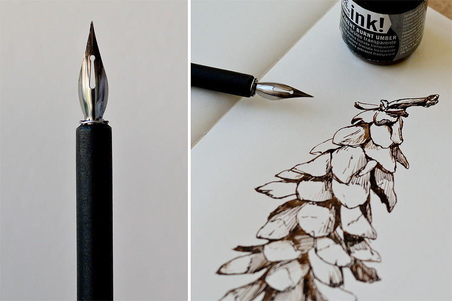 trekpen als schrijfgereedschap gebruikt. Veelgebruikte inktsoorten zijn Oost-Indische inkt en lichtechte gepigmenteerde inkten die watervast opdrogen.