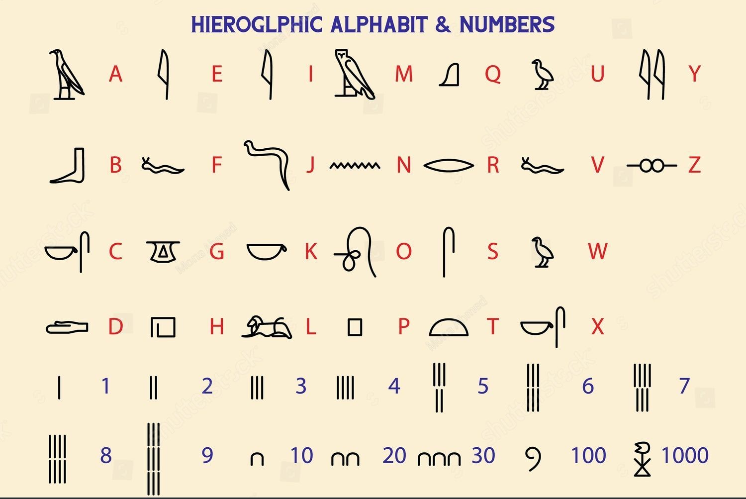 Aan de hand van onderstaand Egyptisch alfabet zie welke tekeningen werden gebruikt om aan te tonen wat er beschreven wordt.
